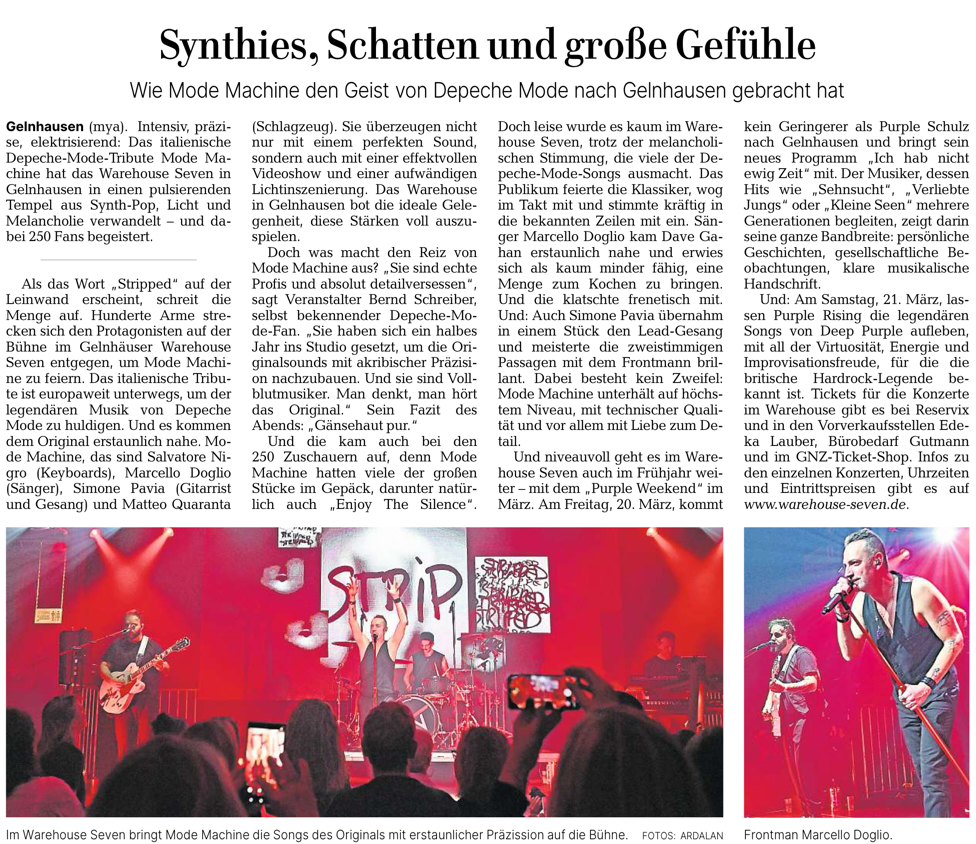 Musicians from the provinces of Milan, Varese and Bergamo have chosen to embark on a path that is not easy outside the Italian borders for a professional growth of the band useful to bring their project to higher and higher levels by confronting realities other than the territorial ones. Germany, Switzerland, Austria, Czech Republic, Slovenia, Slovakia, Romania, Belgium are the countries visited in important clubs and festivals, a path that they continue to take in parallel with the Italian one. These are Mode Machine, gears of music, passion and careful reproduction of sounds to give you with great respect for the original band the quintessence of Depeche Mode.